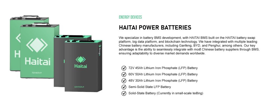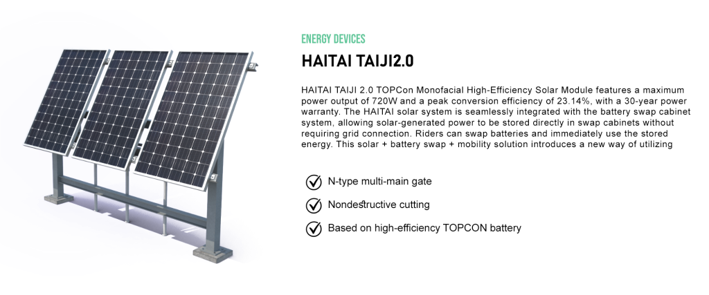 Haitai has developed an independent energy station that operates without relying on the national power grid, integrating solar power generation, battery swap cabinets for energy storage, and a seamless battery swap system. Users can swap batteries to meet transportation needs and even take them home for household power supply. All equipment has been extensively tested by a vast number of users, and the Haitai battery swap platform ensures a highly integrated system that supports various daily applications, including food delivery, logistics, passenger transport, and home energy storage..